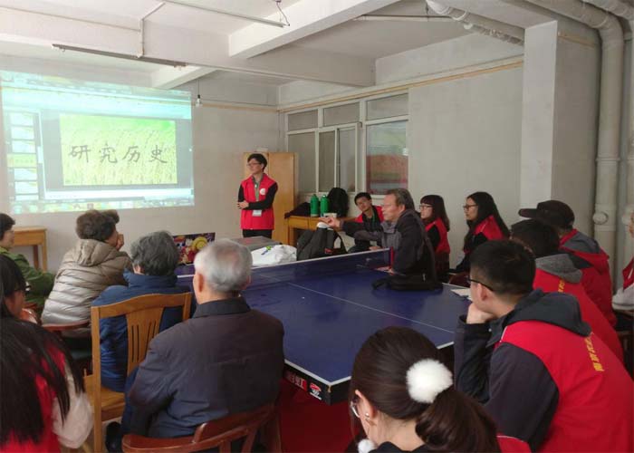 讲堂开始后,主讲人用PPT对“杂交水稻”进行讲解。讲解内容以杂交水稻的定义、营养等方面开展,老人们听的很认真。主讲人讲解结束后,还有志愿者利用自己所学对杂交水稻做出补充,并以“杂交水稻”和“转基因水稻”为话题,与老人们开展了一个小型“研讨会”。老人们积极地发表了自己的观点,提出了一些疑问;志愿者们耐心地倾听,认真地解答。