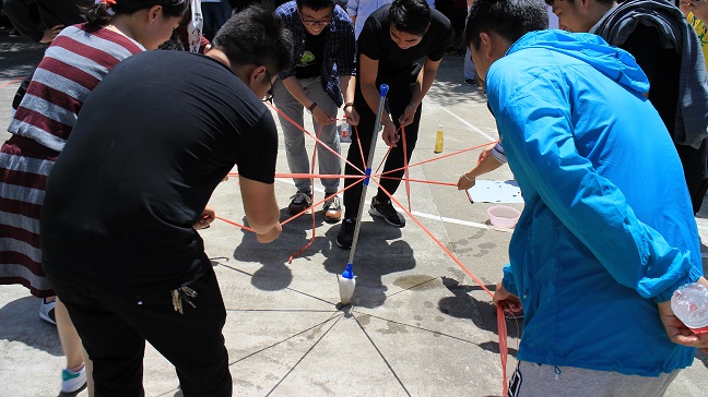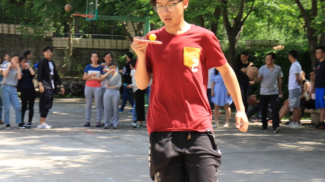 本次趣味运动会围绕着“跃动青春,活力飞扬”的主题,设置了六个趣味运动项目,分别是定点投篮、猛龙过江、无敌风火轮、乒乓接力、室外保龄球、合力写字。