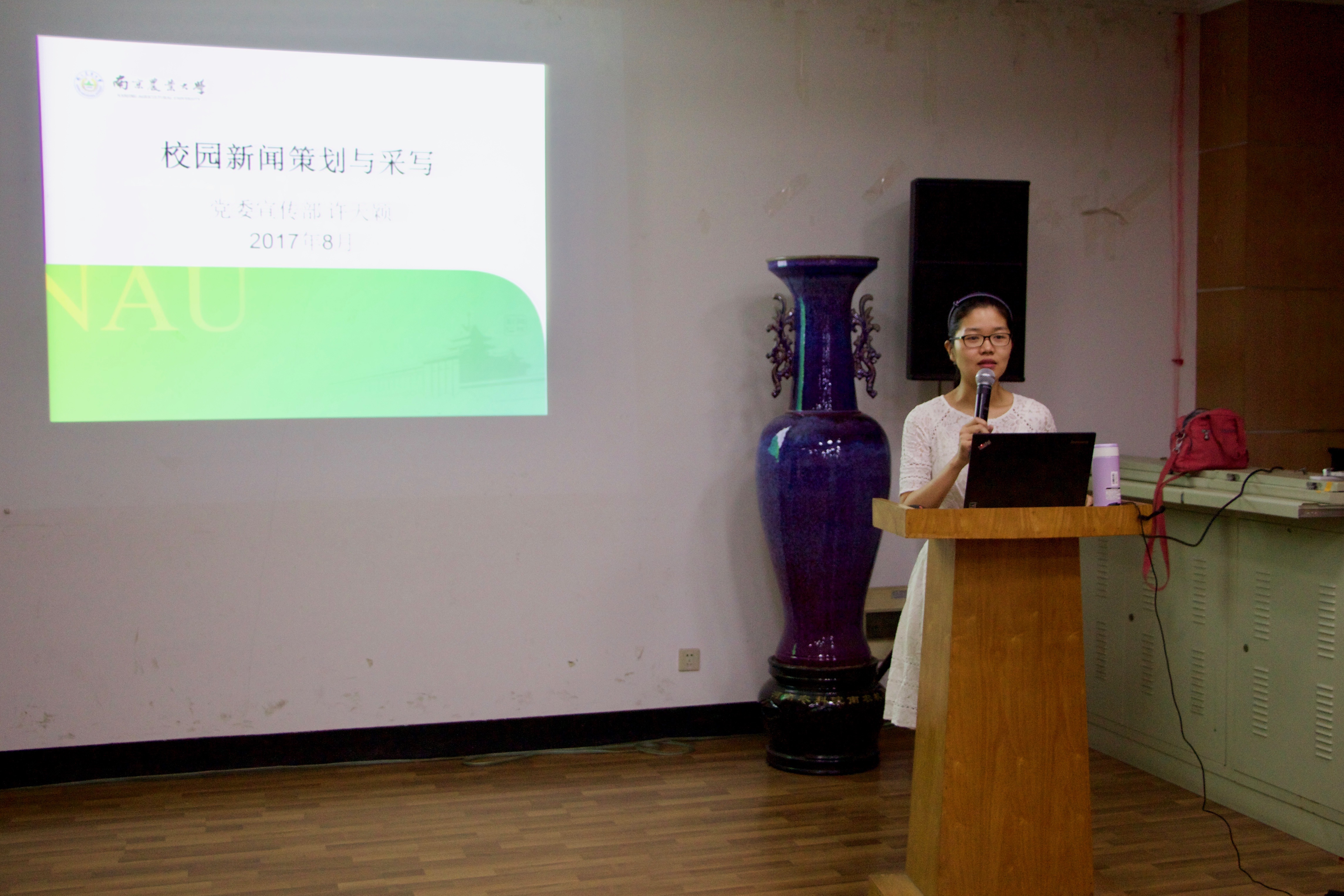 8月30日上午,校党委宣传部全媒体中心许天颖老师受邀主讲校园新闻的策划与采写。在一个半小时的时间里,许天颖老师详细地讲述了关于校园新闻的策划与改写的整个过程和具体要求,包括新闻的发现、策划以及采写的要点和规范内容。其中许老师着重讲解了如何发现值得报道的新闻、采访技巧和新闻的结构形式,并举了三篇新闻作为例子来说明新闻六要素和撰写的具体结构。许老师还强调要根据时令和学院特色对新闻进行提前策划,并为院学生干部提出了一系列关于迎新期间新闻采集与撰写的宝贵建议。许老师在最后提出,在新闻媒体的各个方面都在不断的改进的当代,校园新闻的语言风格应以追求短、平、快为目标,希望15级91自拍 学生干部能在原有新闻内容的基础上去创新和思考。