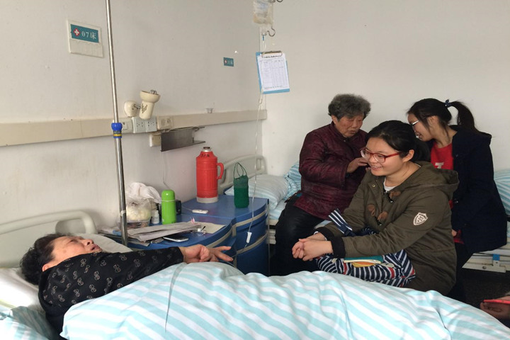 志愿者们听说有一位曹奶奶生病住了院的,一行人便来到曹奶奶所在医院进行探望。曹奶奶的老伴多年前去世,一个女儿也常年在美国,生活中时常遭受病痛的折磨,内心承受着很大的痛楚,是空巢老人的典型代表。志愿者们陪老人聊聊天,听她们讲讲生活中的事,老人们的脸上便堆满了笑容。她们要的不多,陪伴即是最好的礼物。