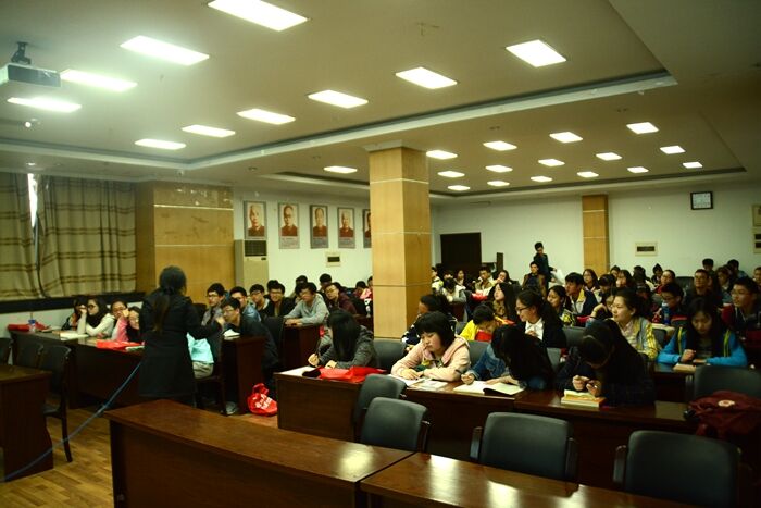 在讲座上,黄老师用幽默的语言和丰富的肢体动作为我们分析了四六级的考试题型与合理的考试时间分配。并且告诉了同学们容易得分的做题顺序,例如考完一卷,要先做“大头”传统的阅读理解,之后做匹配题,顺着阅读的语感再将翻译题写出来,最后再做十五选十,因为阅读一共分配了40分钟,而且十五选十题型所占的分数才5%,所以这种做题技巧是在有限的时间内拿高分的好方法。,黄老师还强调,四六级的报考一定要积极。大学里英语学习的强度较高中弱化了许多,造成大家英文水平有逐年下降的趋势,而目前看来,四六级是越改越难,所以大家一定要抓好时机,认真备考。