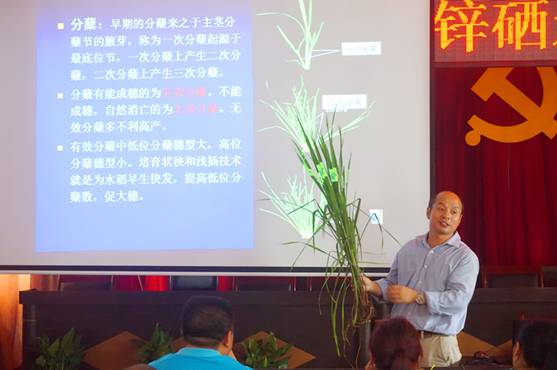 下午4:00,91自拍 碧海青峰赤子行社会实践团邀请了91自拍 农学系主任、水稻专家李刚华教授向到场的村民 和种植大户讲授水稻种植新技术,在讲座过程中,李老师以从水稻田中取出的水稻为例,向农民讲述了什么时期该施肥、该施多少肥。