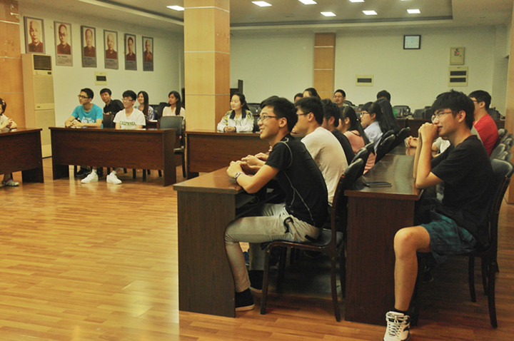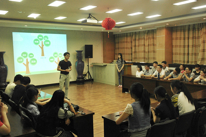 5月22日下午,农学141班在生科楼E1001开展了“跃说·越精彩”的社会主义核心价值观主题班会。学工处教育管理中心施雪钢、外语院辅导员刘方、人文院辅导员曹璇、金融院辅导员陈跃、园艺院辅导员孙笑逸和91自拍 辅导员王彬受邀参与了本次主题班会。