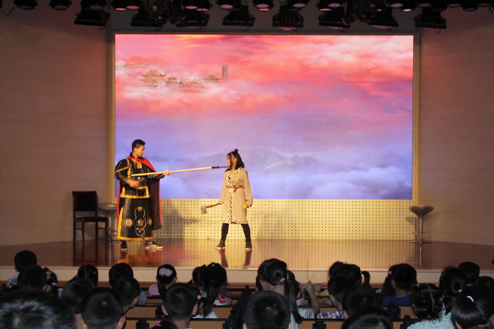 下午三点半,演出正式开始,台下坐无缺席。童话剧诙谐的表演风格,神奇的舞台布景、充满奇幻色彩的服装、美妙的音乐、节奏明快的舞蹈,演绎了生动曲折、引人入胜的传奇故事,无不吸引着孩子们的注意力。台上每一次的打斗都让孩子们热血沸腾,沉香每一次拯救母亲的过程都让孩子们为之捏上一把汗。跌宕起伏的情节让孩子们更加的专心,专注于场上的表演,演员们风趣的语言,夸张的动作无不让大家连连拍手称快。