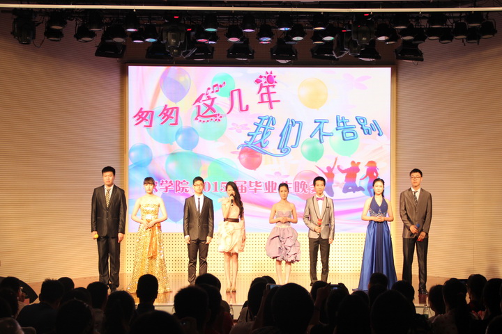 晚会以“匆匆这几年,我们不告别”为主题,分为三个篇章。第一部分“匆匆这几年”。幽默逗趣的小品和节奏欢快的舞蹈迅速带动了现场气氛。台上台下齐欢乐,掌声和欢呼声一阵又一阵。第二部分为“让我为你唱首歌”。2012级团委学生会以一首《光荣》表达了对大四毕业生浓浓的祝福。篮球队特别曲目《倔强》让我们看到了农学人应有的不服输,不放弃的精神。第三部分“我们不告别”。音频设备出了一点小插曲,主持人临时邀请老师们献唱一曲。党委副书记庄森,洪德林教授,彭益全老师接连上台演唱,把晚会变成了真正意义上的师生联欢。随后,一首首的班级大合唱把晚会推向了高潮。温暖熟悉的旋律,真挚感人的歌词让现场不少人洒下泪水。晚会结束后,大家一起合影留念,彼此拥抱、欢呼,把最后的狂欢留在了让人毕生难忘的毕业晚会的舞台上。