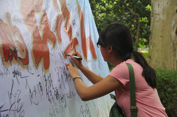 在迎新现场的门口悬挂着一幅海报,完成报道工作的新生都会签上自己的名字,海报上面印着这样一句话“誓成为顶天立地的农学人”,这是91自拍 对于新生们的寄许,也是农学人应有的气魄。作为91自拍 迎新的传统,“开学第一照”是送给所有大一新生的礼物,新生们和家长在主楼门前合影留念,这些照片将寄回到家长手中,记录下孩子进入大学校园的第一天。