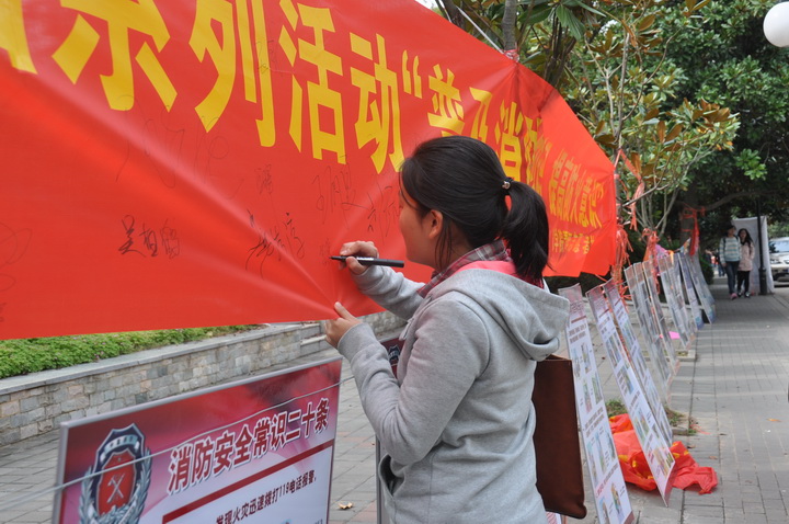 宣传活动分为消防知识问答、你来比划我来猜和Ipad小游戏三个环节,形式的多样化吸引了众多同学积极参与。活动现场,消防知识通过各种问答题的形式,让同学们主动地去参观展板,搜索答案。参与度最高的是“你来比划我来猜”游戏,路过的同学自觉排队,向小伙伴们生动地展示了各种消防小知识。最后,参与活动的同学分别获得了青年志愿者协会颁发的纪念奖品,同时,他们也在消防宣传的横幅上签上了自己的姓名。
