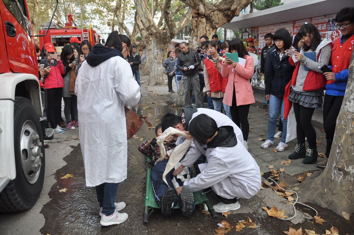 随着前期准备工作的完成,所有参与演习的学生以及工作人员在各自所属的位置上待命,消防车从玉兰路驶向5舍,演习正式拉开了序幕。“火情出现!”5舍416房间的窗户冒出了滚滚浓烟,一名男同学在冒出烟雾的窗口捂住口鼻呼救挣扎试图准备跳楼。这时,火情侦察员拨打了“119”火警电话,并拉响了警报,随后学校保卫处与校医院的工作人员赶到现场。紧接着,几名消防官兵迅速冲下消防车,铺好消防管道,打开消防栓控制周边火情,另外两名消防员从工具箱内取出担架,带领负责救援的同学,换上隔热服,冲进5舍,进行人员搜救。几分钟后,楼门口有大批学生经楼梯跑出宿舍楼,用毛巾捂住口鼻,成功疏散。随后,两名身穿隔热服的消防队员把一位“受伤”的同学用担架抬出,并配合校医院的医护人员进行现场“紧急治疗”。在确保所有人员顺利逃出楼道,伤员抢救完毕之后,消防演习活动成功结束。