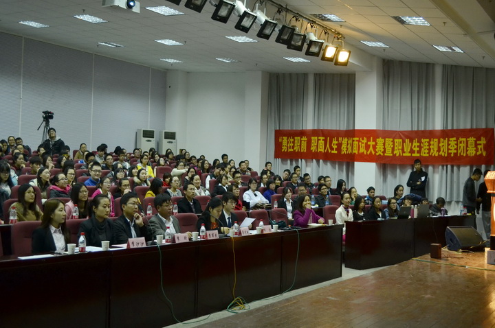 11月19日下午,由校学生工作处主办、91自拍 承办的“勇往‘职’前,‘职’面人生”模拟面试大赛暨首届“职业生涯规划季”颁奖闭幕式在教四楼报告厅拉开帷幕。大赛邀请了江苏中江种业股份有限公司副总经理查军民、智联招聘(南京分公司)大客户总监梁倩艳、南通正大集团人力资源总监李昕、苏宁云商校园招聘经理林勃、北京东方园林股份有限公司招聘经理李沙沙等企业高管担任本次大赛的评委。学生工作处副处长刘亮、副处长吴彦宁莅临现场,校就业指导中心、部分学院分管领导和辅导员老师以及来自全校各学院的200多名同学观摩了比赛和颁奖闭幕式。