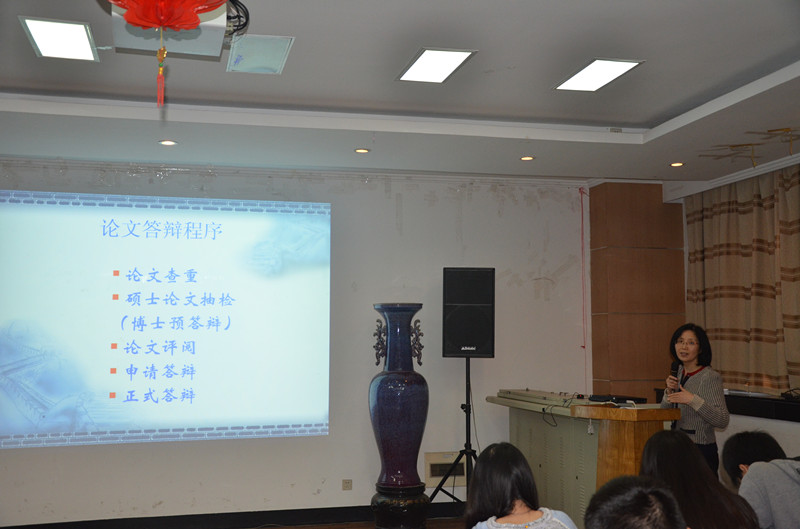 李雪琴首先就目前我校硕士学位申请与论文答辩的相关流程以及注意事项,从论文答辩条件、论文答辩程序两个方面对应届硕士毕业生们进行了深入浅出的指导。此外,她还特别强调从2013年开始实施的论文查重环节,并在会上耐心介绍了博士生预答辩申请、硕士毕业抽检、申请学位等论文答辩的程序与相关具体要求。其后李老师对同学们提出殷切期望,即在把握时间走好答辩流程的同时,为研究生与博士生研究生涯画上完美的句号,最后她给在场同学送上了美好祝福。