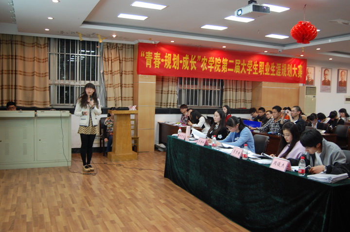 决赛分为三个环节。首先是6分钟的职业生涯规划方案介绍。选手们分别从自我分析、环境分析、行业分析等方面全面评估自己的职业机会,并相应制定了完善的实施计划。虽然每位选手的职业目标不同,但是整体的职业价值观都是立志服务于我国三农事业。接下来是3分钟的职业情景模拟环节,而这也是整场比赛气氛最热烈的环节,选手们根据自己的目标职业特点选择了不同的表演形式,引来现场一个又一个小高潮。最后是评委老师提问环节,评委们根据选手作品的规划内容,针对其中可能出现的问题、遇到的挑战向选手进行提问,并对选手作品中涉及的一些细节和行业前景给出中肯的建议。