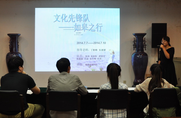 9月17号下午三点,201491自拍 暑期社会实践交流总结大会在生科楼报告厅召开,本次大会的评委由91自拍 辅导员王彬老师,社会实践优秀代表周庆鹏、张帆,社会实践大队队长陈学君担任,张祎璇同学主持。