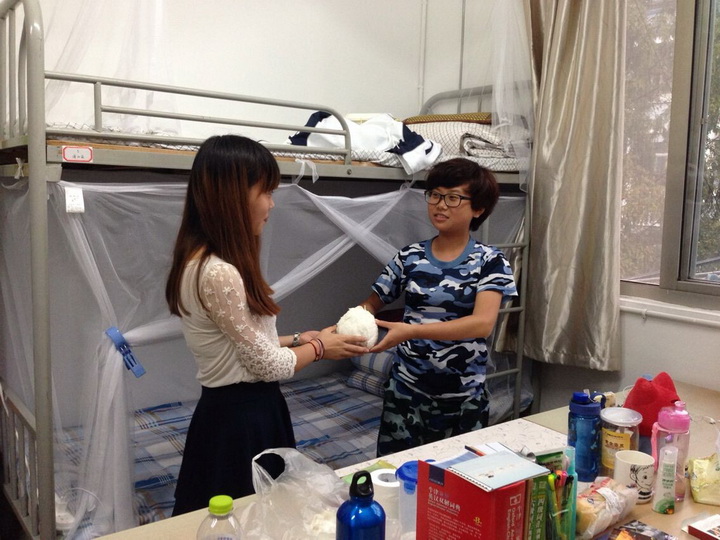宿舍里,同学们正在休息,看到学生会干部送来了慰问品,纷纷表达了感谢。利用这次机会,学长学姐也和学弟学妹们交流了军训中的酸甜苦辣,并勉励大家刻苦训练,发扬吃苦耐劳的精神,军训也是一次难得的锻炼机会,希望他们好好珍惜。同学们也微笑着表示:一定会圆满完成军事训练任务。