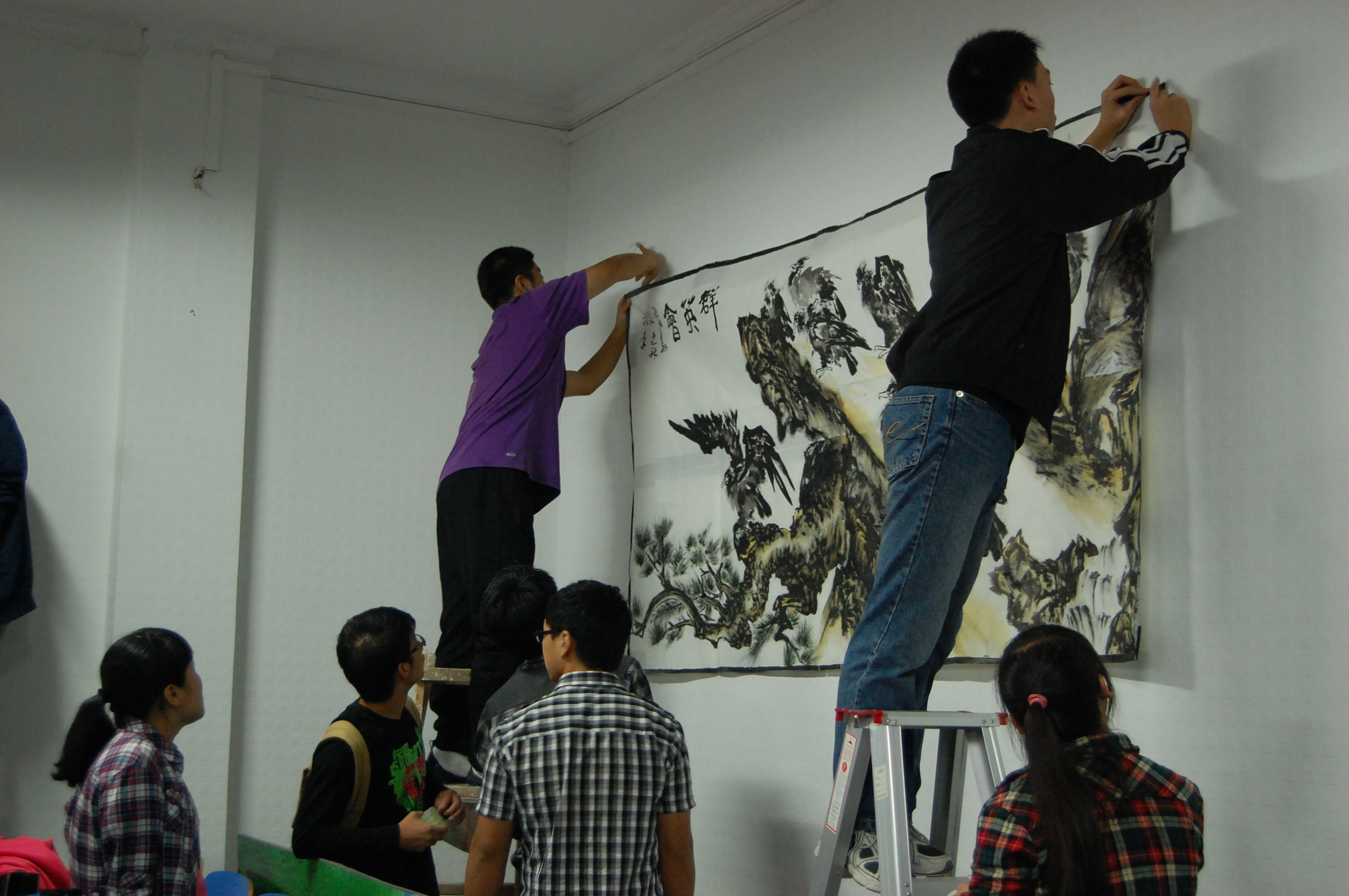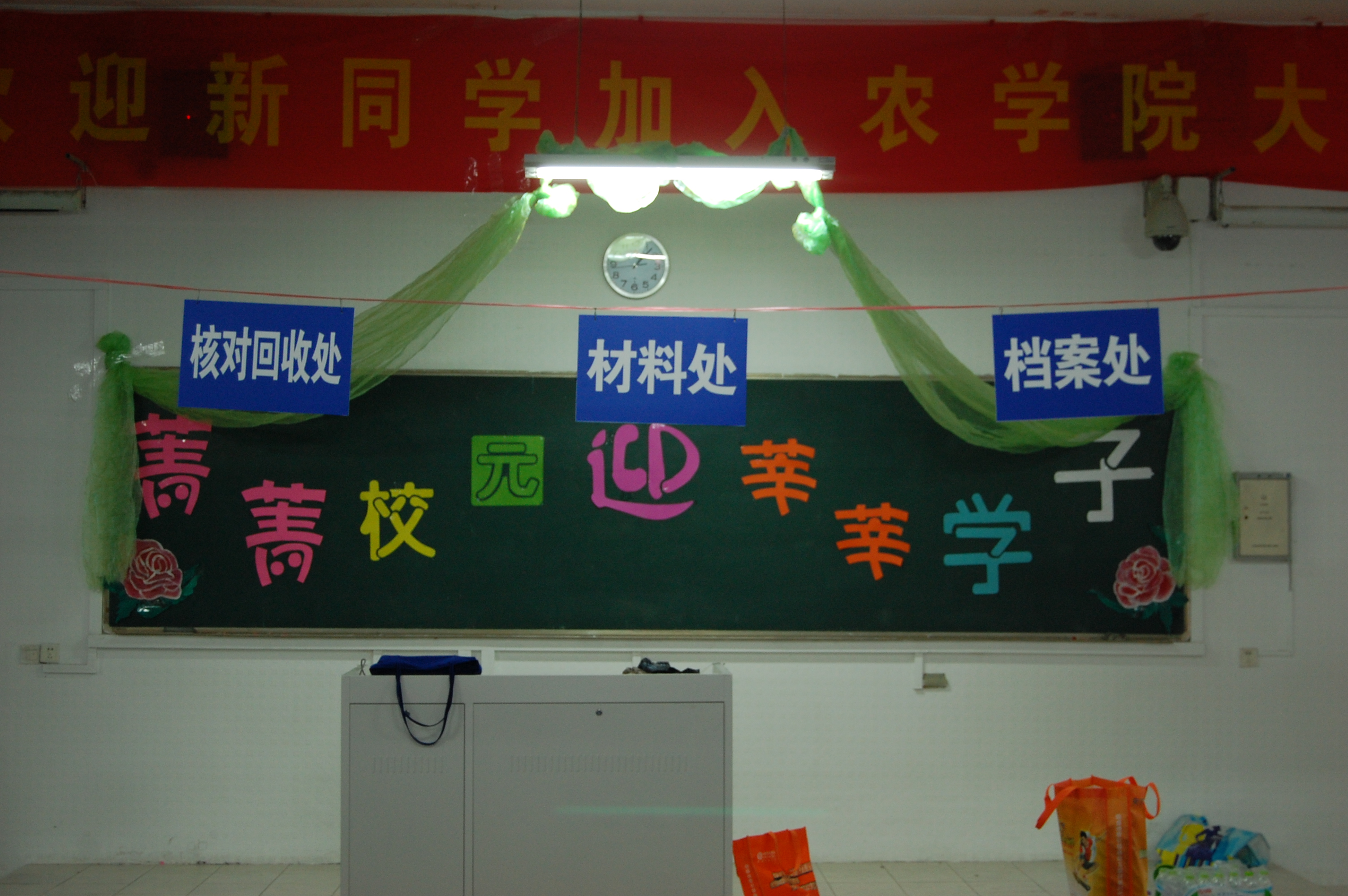 “今年的主题是‘菁菁校园迎莘莘学子’,是大家一起想出来的。会场的布置以营造温馨的气氛为主旨,让新同学们能感受到91自拍 大家庭的温暖。”学生会主席周庆鹏介绍道。门口摆放的宣传板上是学长学姐们的祝福寄语,黑板上贴着醒目的标语彩纸,窗户上装饰的是同学们吹出的五彩气球,墙壁上是动感的人物剪影贴纸。更有一幅气势雄浑的大型中国画为会场增添了浓浓的中国风,这幅画是才华横溢的宣传部部长丁园的杰作。大家团结协作,互帮互助,将91自拍 迎新会场布置的温暖美丽。