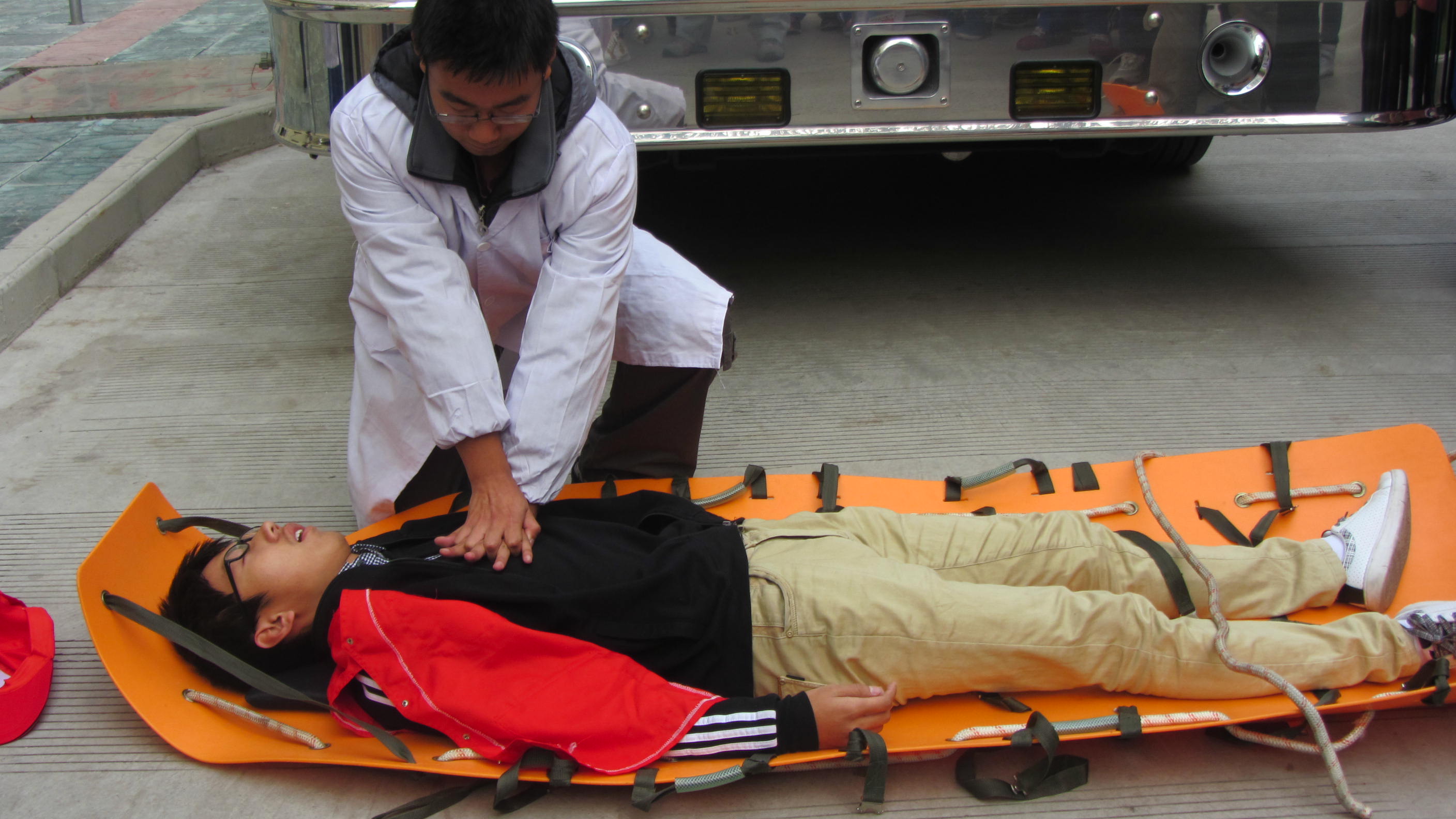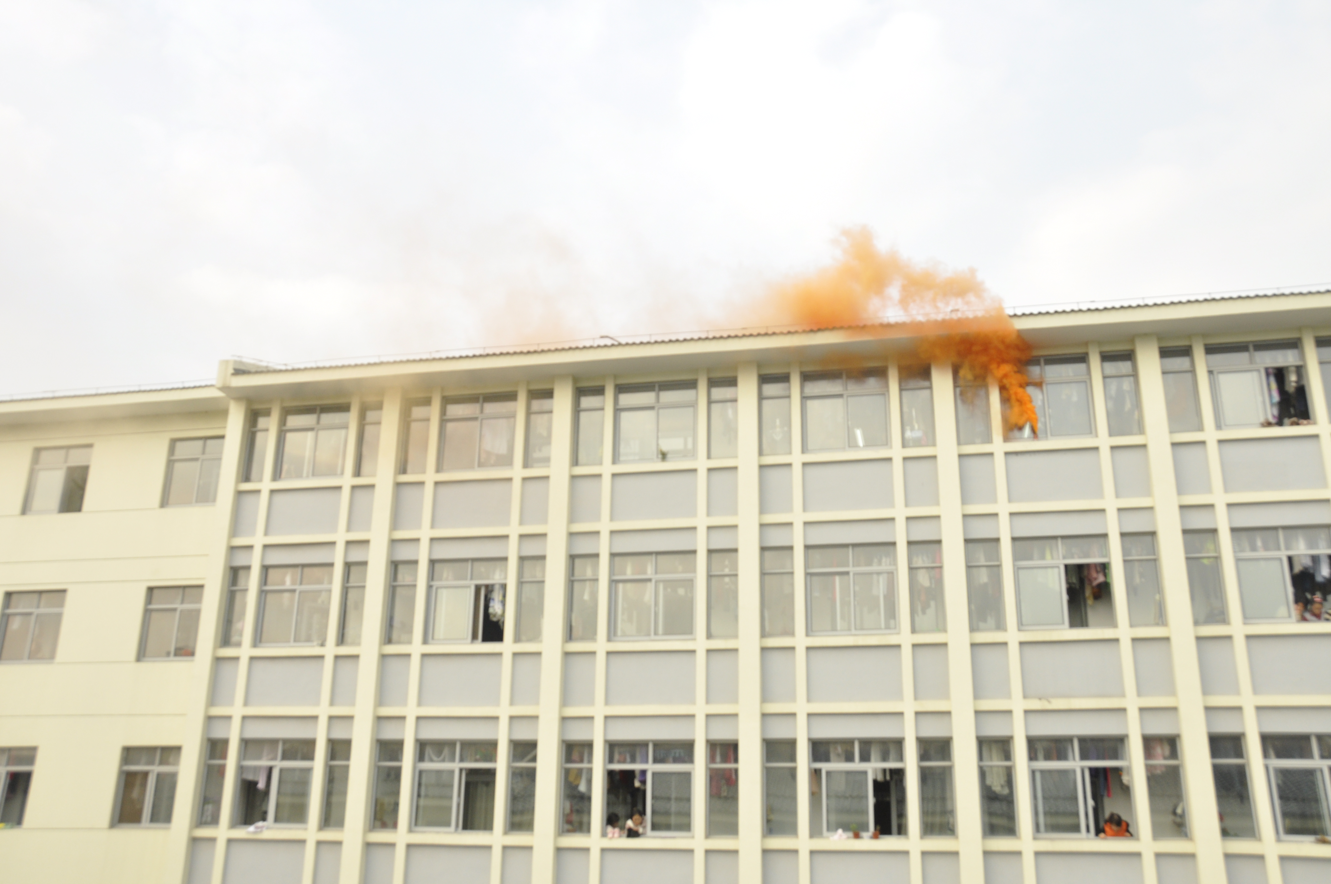 下午3:00,所有参与演习的学生以及工作人员在各自所属的位置上待命,随着闪着警灯的消防车从玉兰路驶向19舍,演习拉开了序幕。“火情出现!”19舍8楼的窗户冒出了红色烟雾,一名女同学在冒出烟雾的窗口捂住口鼻呼救挣扎着。这时,火情侦察员拨打了“119”火警电话,并拉响了警报,随后学校保卫处与校医院的工作人员赶到现场。紧接着,消防官兵从消防车工具箱内取出担架,带领负责救援的同学,换上隔热服,冲进19舍,进行灭火搜救。几分钟后,楼门口就有大批学生经楼梯跑出宿舍楼,用毛巾捂住口鼻,成功疏散。随后,两名身穿隔热服的消防队员把一位“受伤”的同学用担架抬出,并配合校医院的医护人员进行“紧急治疗”。在撤离结束、伤员清点之后,演习圆满结束。
