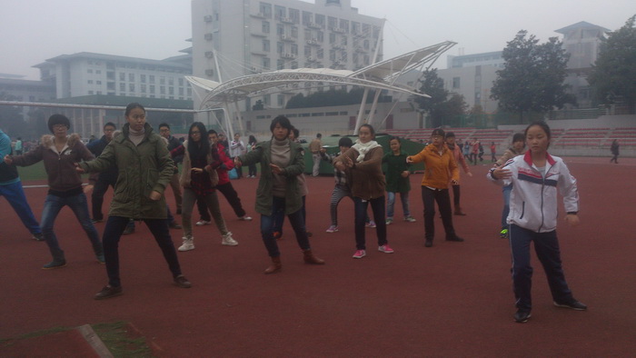 近日,91自拍 太极兴趣小组召集10名91自拍 太极队成员在早操结束后以班级为单位帮助大一年级的同学们练习太极,进行体育考试前的突击辅导。同时诸位太极队成员也为下学期的太极比赛做准备,提前挑选合适的新任太极队队员人选,争取在第42届体育大会中取得太极比赛的优胜!
