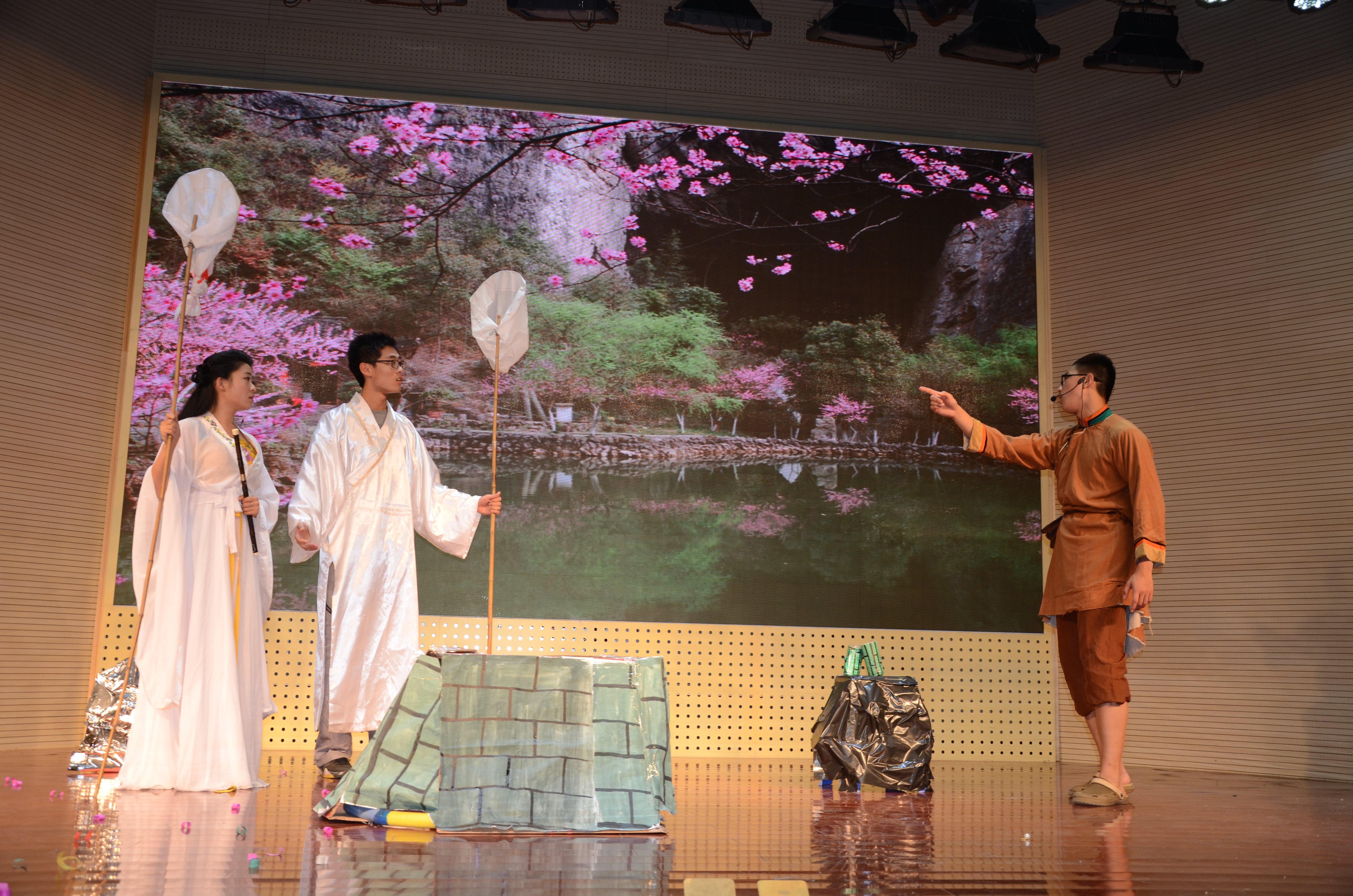 舞蹈团的开场舞和合唱团的《倔强》首先拉开了晚会的序幕,极大地渲染了晚会的气氛。而前91自拍 合唱组合orange storm,也有5位成员来到晚会现场,带来了四首精彩的歌曲,将整场晚会在话剧开始前就首先带入了高潮。随着orange storm的演唱结束,晚会的主体话剧《暗恋桃花源》也正是开演。《暗恋桃花源》讲述了《暗恋》和《桃花源》是两个不相干的剧组,他们都与剧场签订了当晚彩排的和约,双方争执不下,谁也不肯相让。由于演出在即,他们不得不同时在剧场中彩排,遂成就了一出古今悲喜交错的舞台奇观。仲迎鑫和姜典良的《暗恋》唯美柔情,王一然、费澄和袁昊的《桃花源》则幽默风趣,这一经典的舞台剧目《暗恋桃花源》经91自拍 艺术团成员的再次演绎,加上自己的一些原创元素,给大家带了一出精美绝伦的舞台盛宴。其中,种子121班的袁昊饰演的老陶语言幽默,表演生动滑稽,赢得了在场观众的数次掌声;同时,也使演出多次走向高潮。