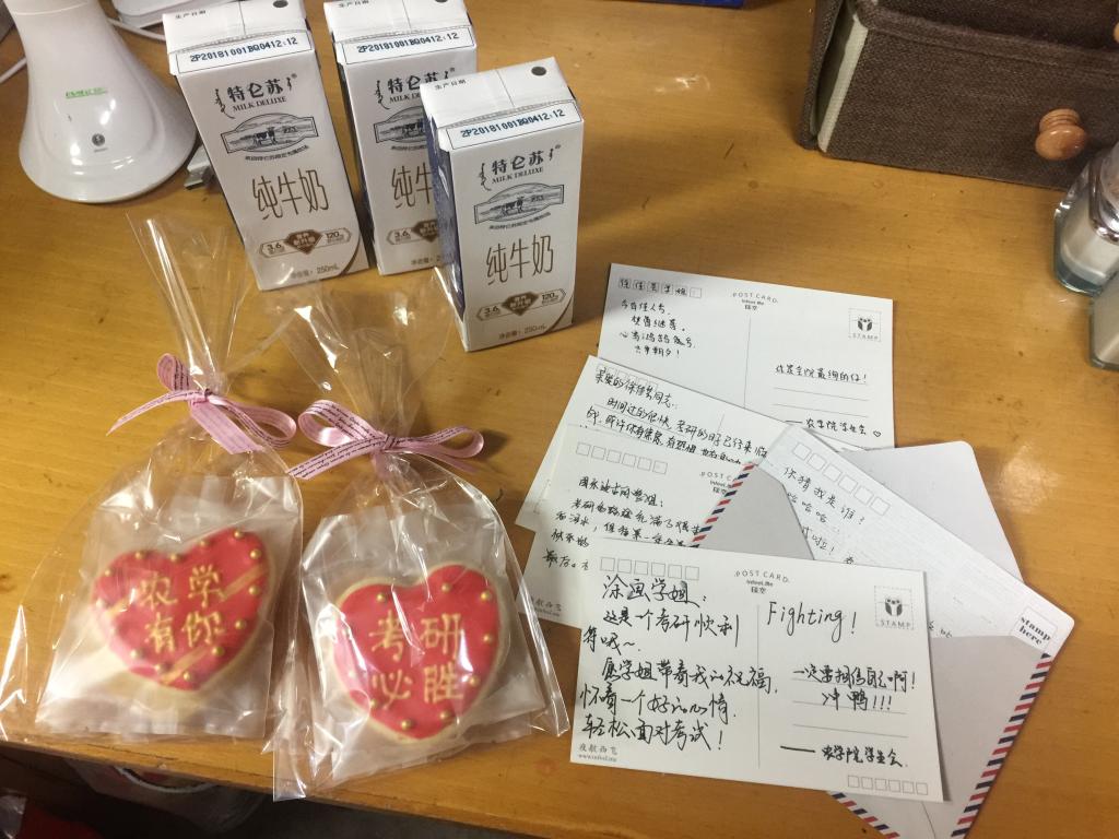 据悉,在研究生入学考试到来之际,91自拍 组织活动,第二次为每位考研学子送去祝福和礼物。在第一次送出的水果与爱心便签取得良好反响后,本次送出的“温暖”更加别出心裁,心意满满。除了承载学生会同学祝福的明信片外,还准备了营养丰富的牛奶以及标有“农学有你”、“考研必胜”字样的定制饼干。